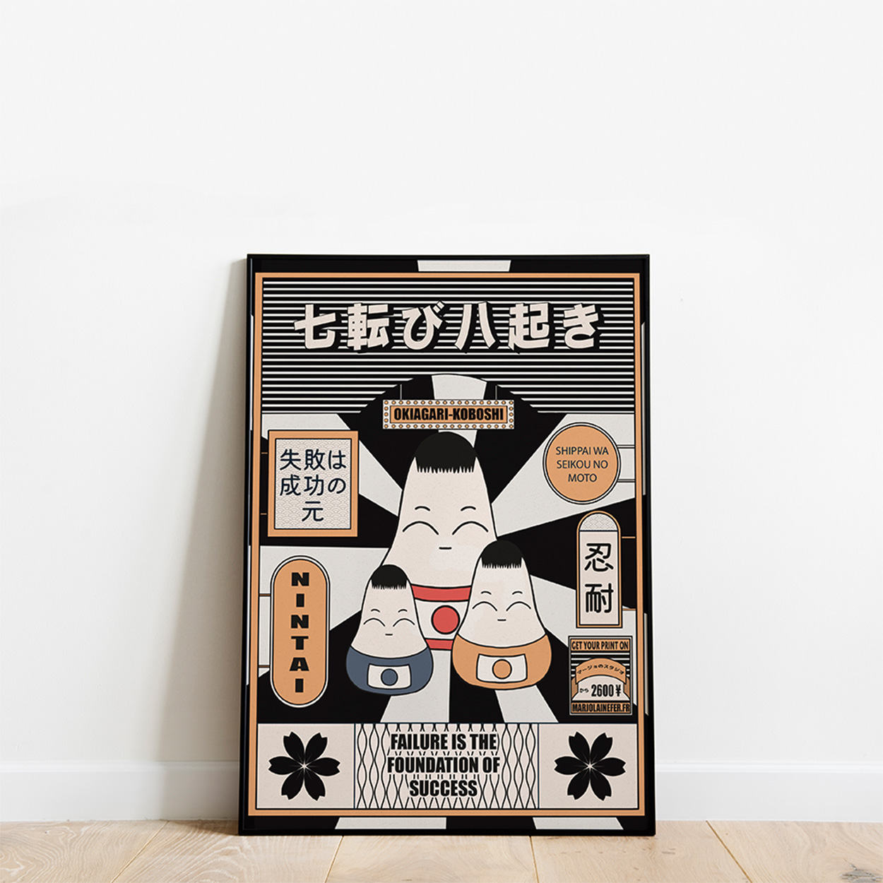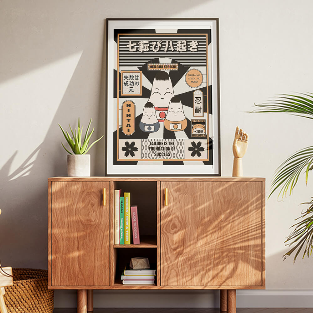 Inspirée du petit personnage japonais traditionnel qui se redresse toujours, cette affiche rend hommage à l’Okiagari-Koboshi, symbole de ténacité. Cette affiche est une belle attention à offrir à quelqu’un qui démarre un nouveau projet